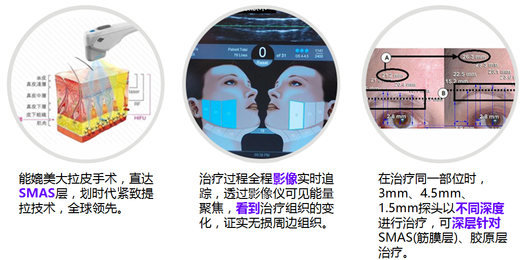 點(diǎn),以產(chǎn)生65℃-72℃高能量,作用肌膚3.0mm-4.5mm的SMAS層,刺激膠原蛋白的