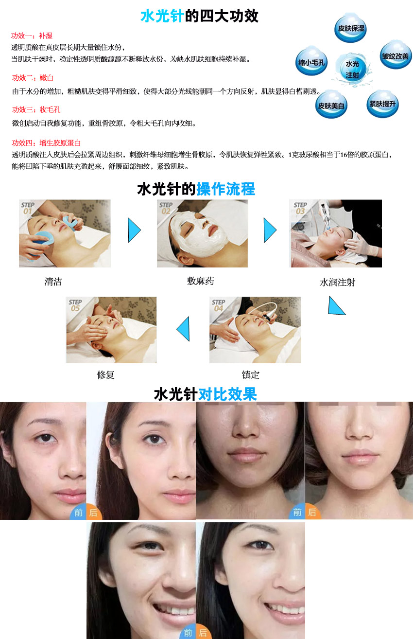 A:水光注射就是利用透明質(zhì)酸直接對(duì)皮膚進(jìn)行注射,能夠讓面部皮膚水潤(rùn)柔嫩、光澤透亮,讓您擁有藝人般光滑透亮的皮膚,能夠解決真皮層缺少水分的問題,改善細(xì)小皺紋,帶來(lái)明顯效果。1次水光注射相當(dāng)于1000次日常護(hù)理,5000次面膜護(hù)理。