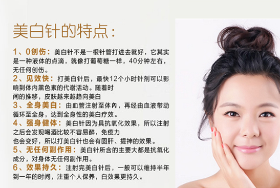 美白針是通過注射的方式來解決面部問題快速分解人體肌膚的黑色素、黃色素,修復(fù)受損細胞,補充活化美白因子使全身美白因子的細胞更新,令全身肌膚由內(nèi)至外白里透紅、恢復(fù)彈性,其特點在于能迅速扭轉(zhuǎn)病態(tài)功能細胞的早衰老化,抑制細胞氧化,阻止黑色素生成,促進新陳代謝,有效減弱和祛除色斑,由內(nèi)而外調(diào)節(jié)肌膚,達到全身美白效果